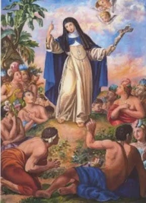 Accompanied by Saint Dominican Guzman and Our Lady of the Blue, the azure sky is like lapis lazuli, and the sky over Turtle Island, the City of the Sun, is pure and flawless. City of the Sun, "My child: I come here as the mother of Jesus and your mother."